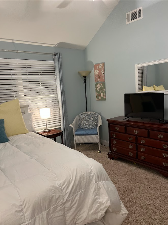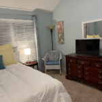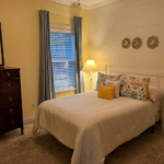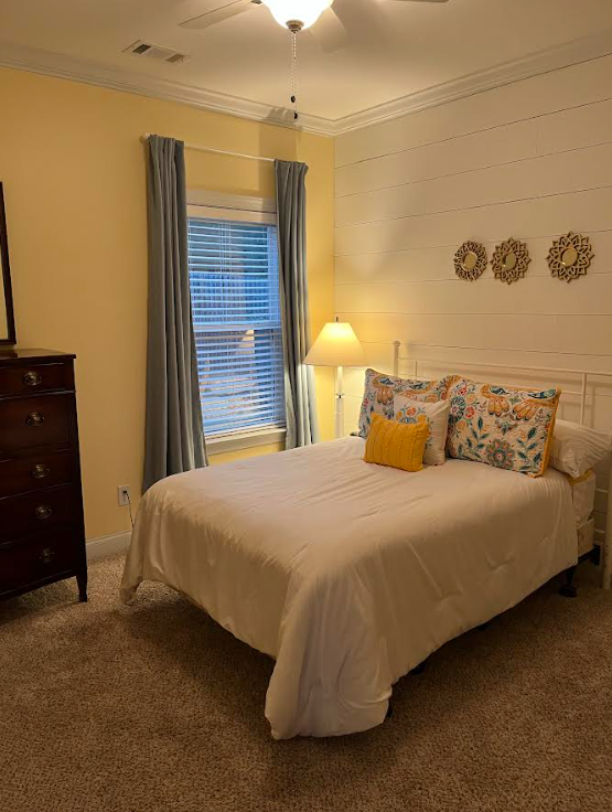 Amenities in each bedroom include a Roku television and a ceiling fan with the option of a standing fan as well. In essence, this southern home is more than just a structure; it’s an expression of hospitality, tradition, and a relaxed appreciation for life’s simple pleasures, designed to foster connection with family, friends, and the surrounding natural beauty.
