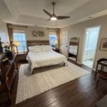 The downstairs master suite provides a its own bathroom and a California king bed. Two additional downstairs bedrooms—one with a king bed and one with a queen—share a hallway bathroom. Upstairs, a fourth bedroom with a king bed offers additional flexibility and also uses the downstairs hall bathroom.
