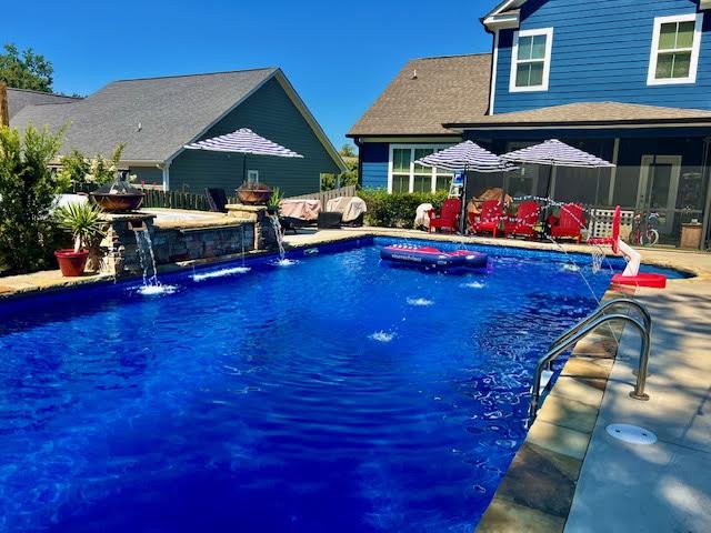 Beautiful two story home located in Evans, GA with 5 bedrooms including large golf enthusiast room, 3 full baths and one half bath, landscaped yard. Backyard features include a saltwater pool with hot tub, fire bowls and water features, covered outdoor entertainment area with fireplace, barstools with bar height area, outdoor games (dartboard, ping pong table, corn hole) and large covered sitting area, a covered and screened patio, and an additional patio with table and chairs.